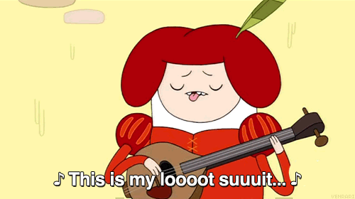 In the episode "Go With Me," Finn is shown wearing a "lute suit" provided by his friend, Jake, in his attempt to convince Princess Bubblegum to go to the movies with him. It is also shown later in the episode when he tries to get Marceline to go to the movies with him.